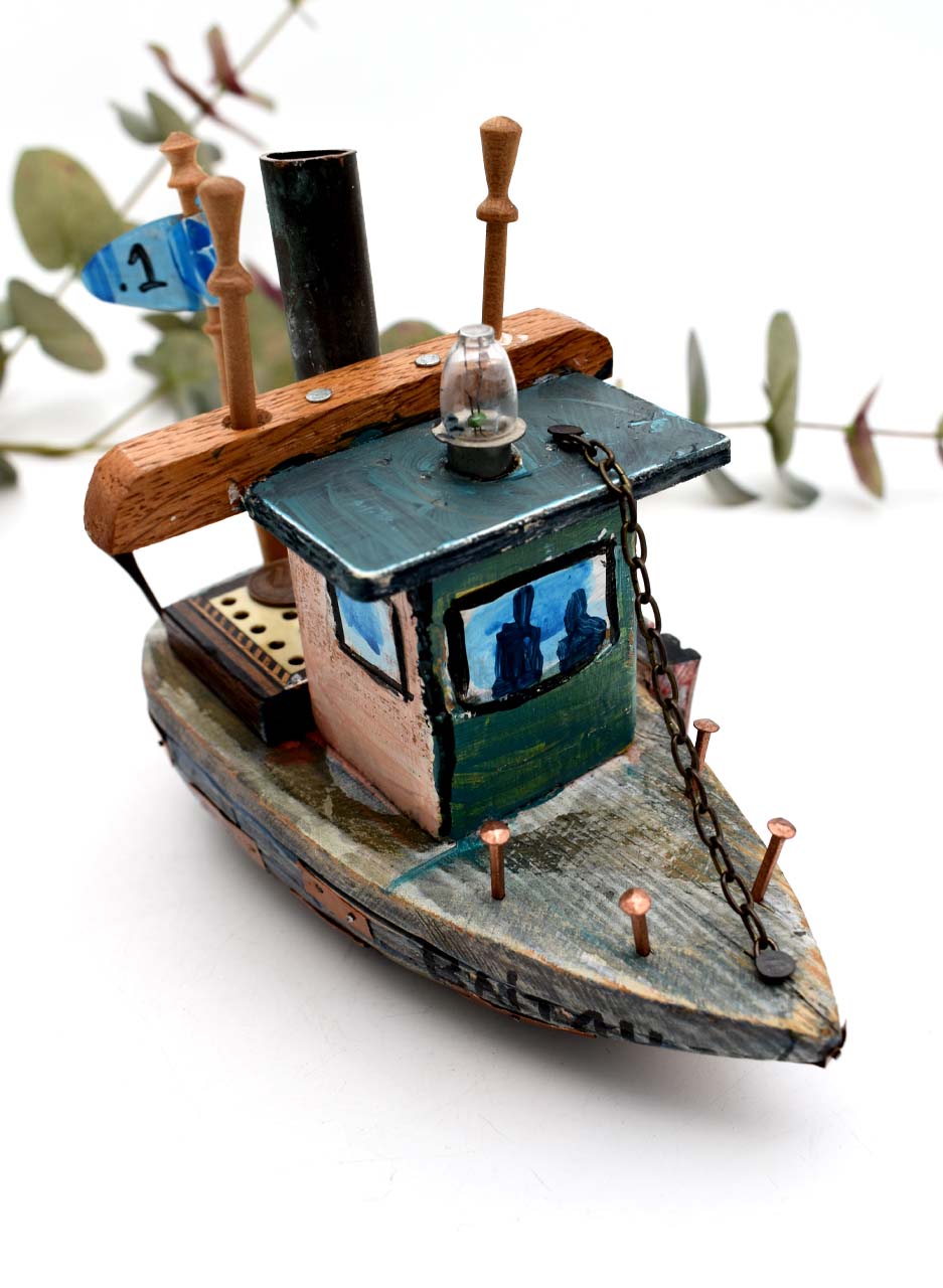Handcrafted in; copper, metal, wood, glass and hand painted – original sculpture by Tracy Skelton