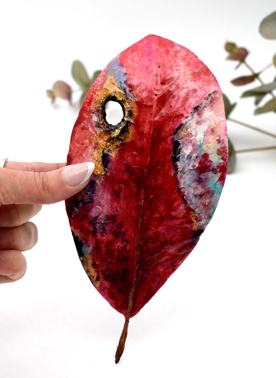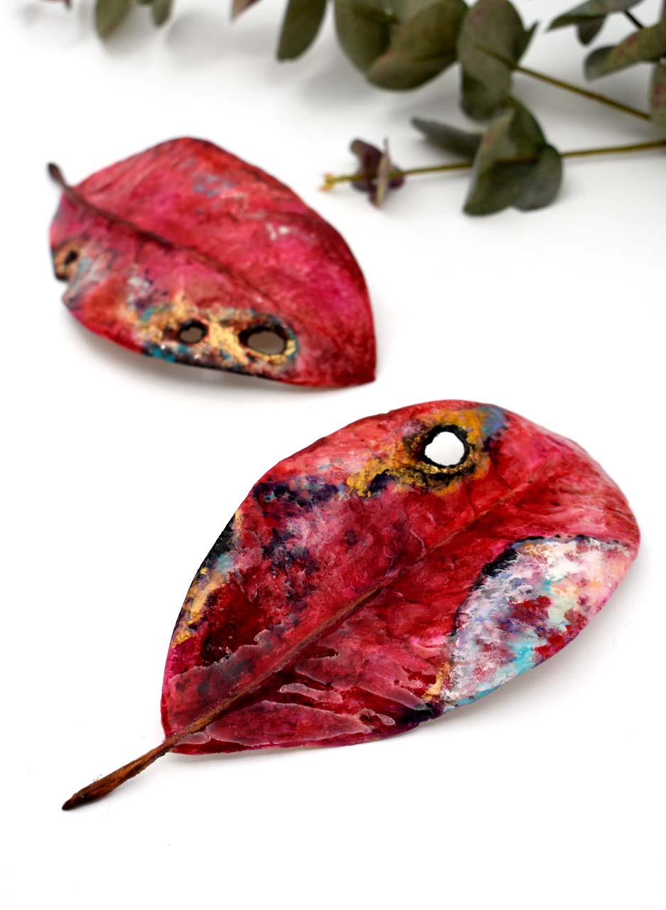 This wall-hung sculptural artwork celebrates the beauty of the Pohutukawa leaf. Each leaf is individually carved from fibre glass composites and paired with a whittled NZ Manuka stalk. Gold leaf accents, oil paint, and a resin finish add depth and texture. Available in a range of vibrant seasonal colours, this piece is a unique tribute to nature.