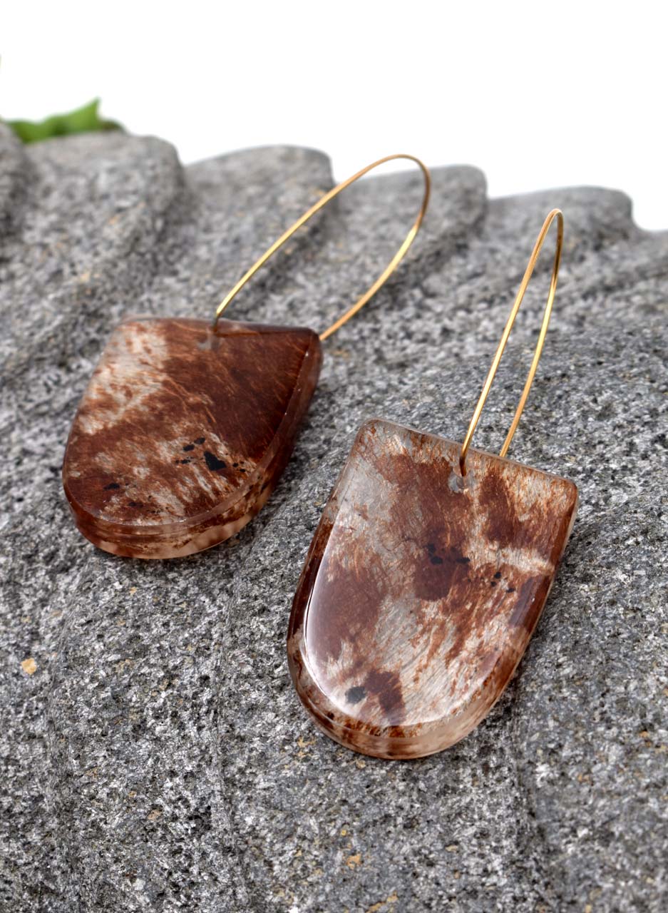 With an eye-catching, organic shape, the Lani earrings showcase the beauty and texture of hand-beaten, unpainted tapa (mulberry cloth) set in resin. Finished with gold-plated stainless steel hooks.