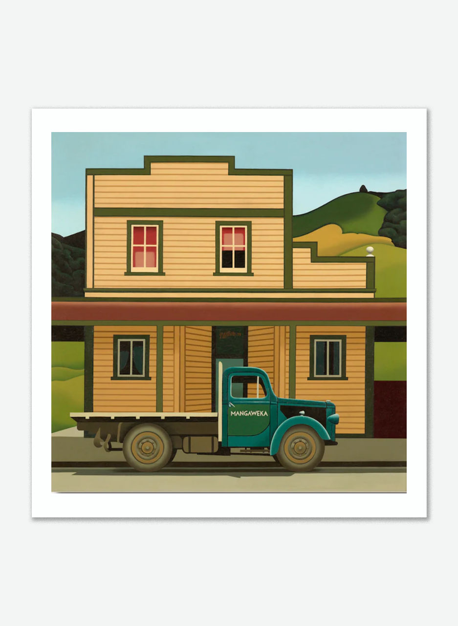 First imagined in 1971 during a road trip with poet Sam Hunt, Mangaweka was painted in 1973 and has become one of Robin White’s most iconic works. Influenced by Rita Angus, it captures the crisp geometry of a rural main street scene — a truck, wooden building, and hills — transforming small-town New Zealand into an archetypal image.