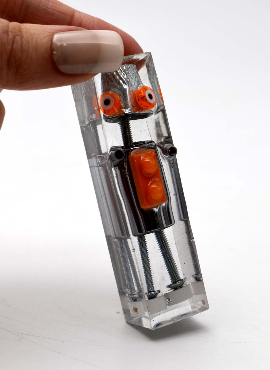 Amanda Watson creates Cryobots—small, resin-encased figures that capture the essence of forgotten technology. Inspired by the aesthetics of retro-futurism, each Cryobot is crafted with precision from computer parts and given a unique identifier, as if frozen in time. Part toy, part sculpture, these creations invite curiosity and storytelling in any space.