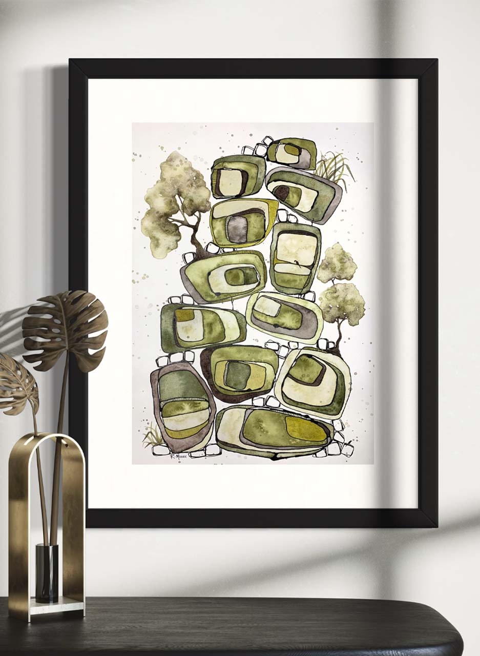 Watercolour in earthy greens and light browns, with fine black ink detailing bringing intricate texture and depth to the piece.
