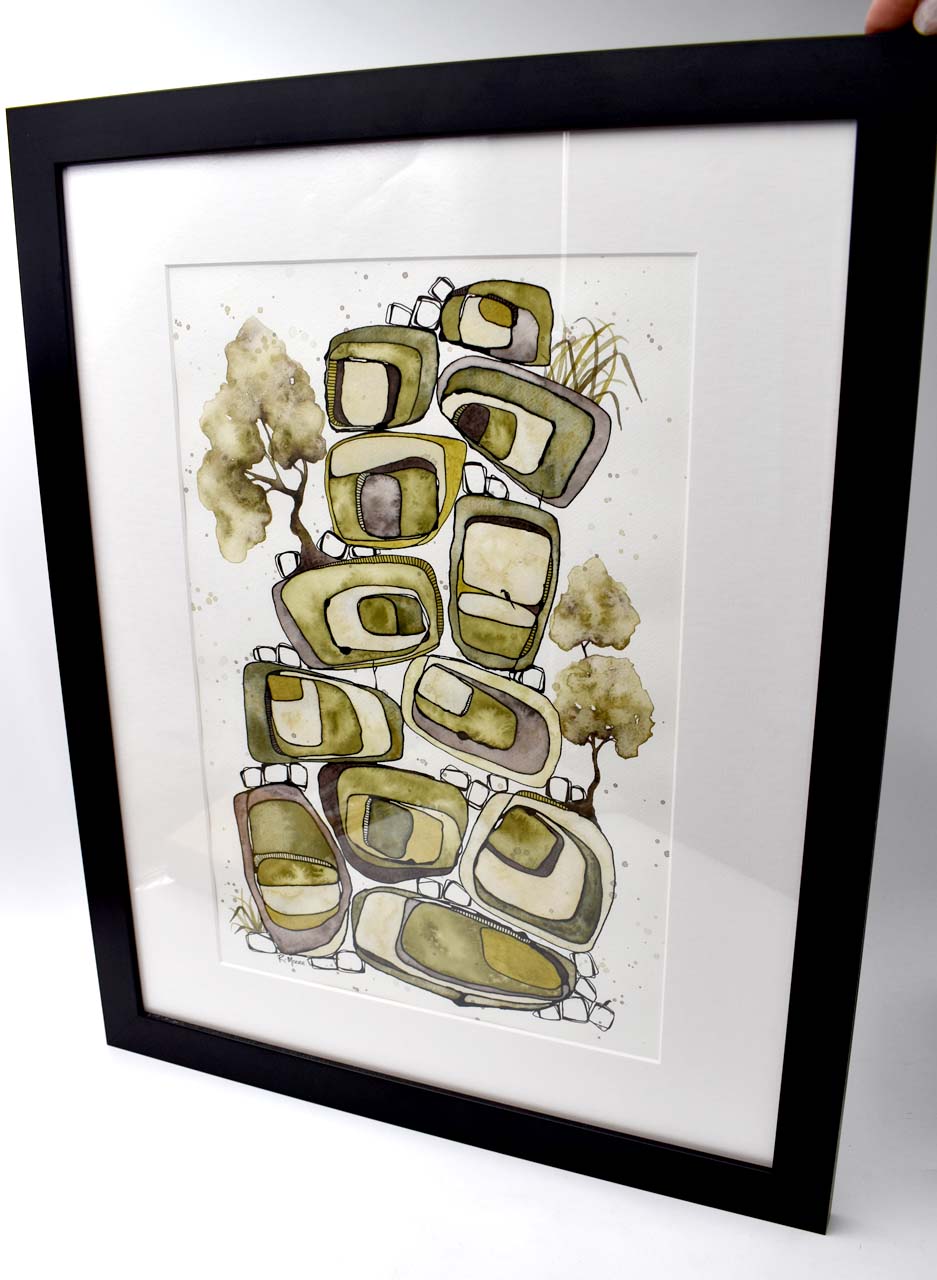 Painted on 300gsm cold-pressed, acid-free cotton watercolour paper, and presented in a solid black wood frame with glass and a frosted mat.