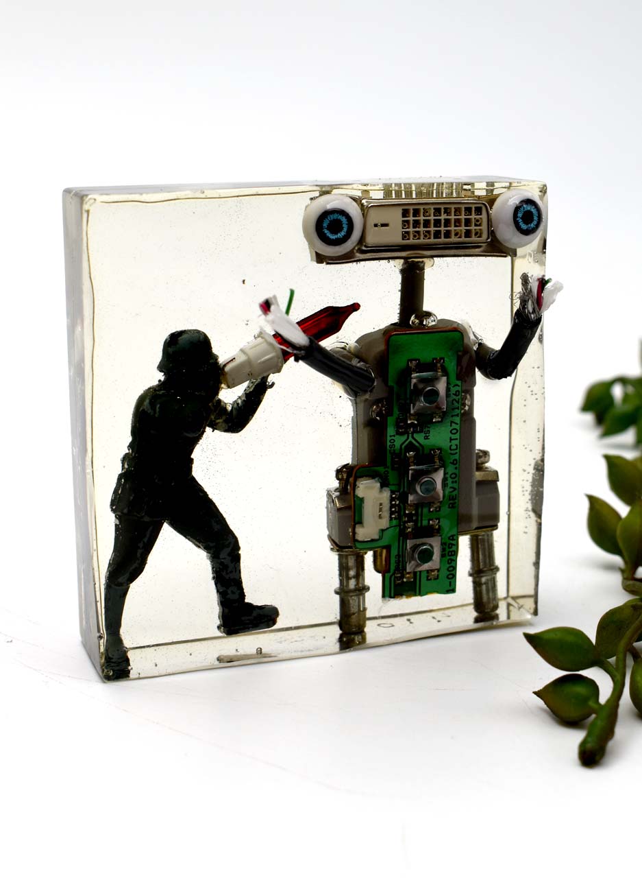 Amanda Watson creates Cryobots—small, resin-encased figures that capture the essence of forgotten technology. Inspired by the aesthetics of retro-futurism, each Cryobot is crafted with precision from computer parts and given a unique identifier, as if frozen in time. Part toy, part sculpture, these creations invite curiosity and storytelling in any space.
