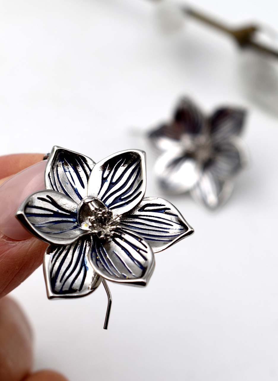 Beautiful, large silver petals with purple veins, orchid flower earrings with a sterling silver hook at the back. They measure 27mm wide by 30mm tall.