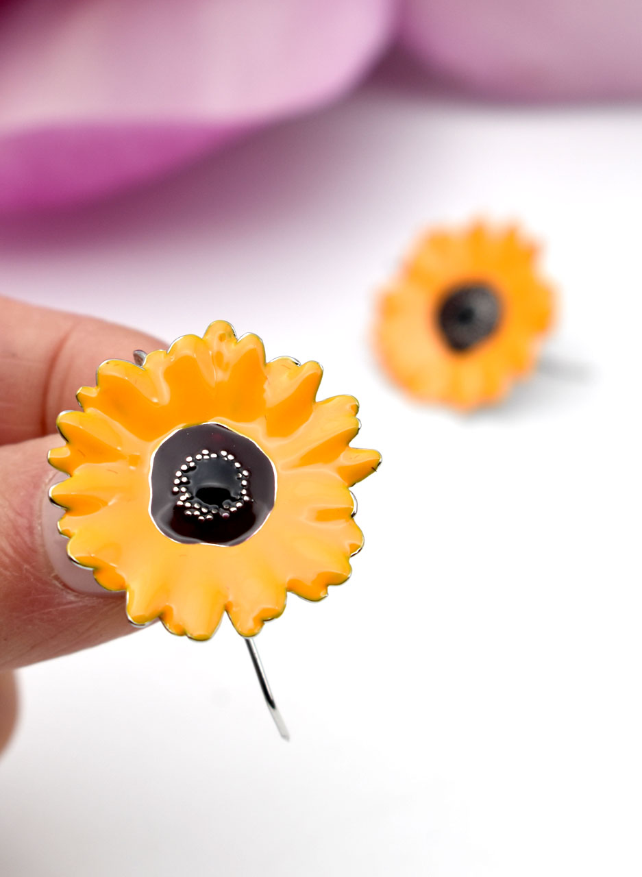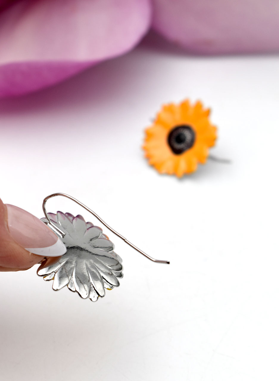 Bright and summery Sunflower Drop earrings that will bring colour and joy to your life! They measure 27mm in diameter and have a sterling silver hook that is about 30mm long at the back of the earring.