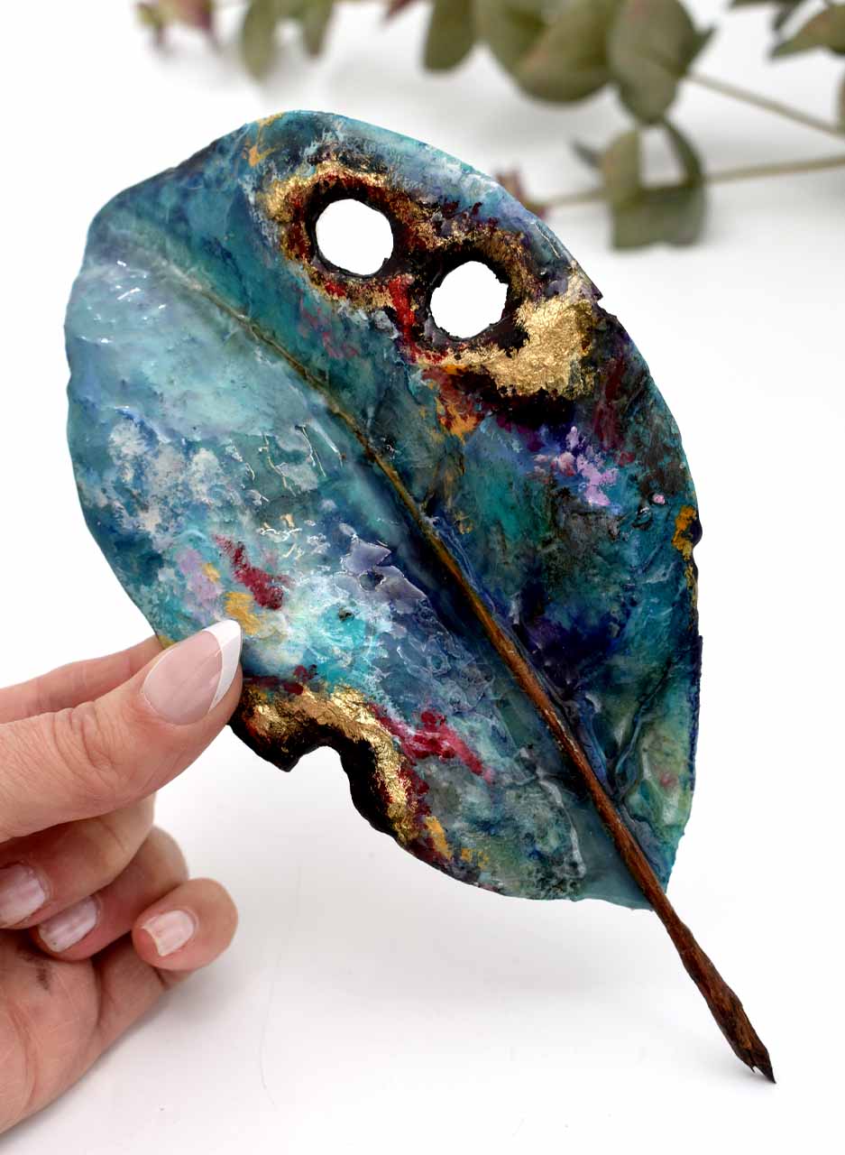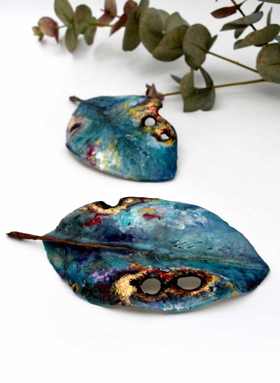 This wall-hung sculptural artwork celebrates the beauty of the Pohutukawa leaf. Each leaf is individually carved from fibre glass composites and paired with a whittled NZ Manuka stalk. Gold leaf accents, oil paint, and a resin finish add depth and texture. Available in a range of vibrant seasonal colours, this piece is a unique tribute to nature.