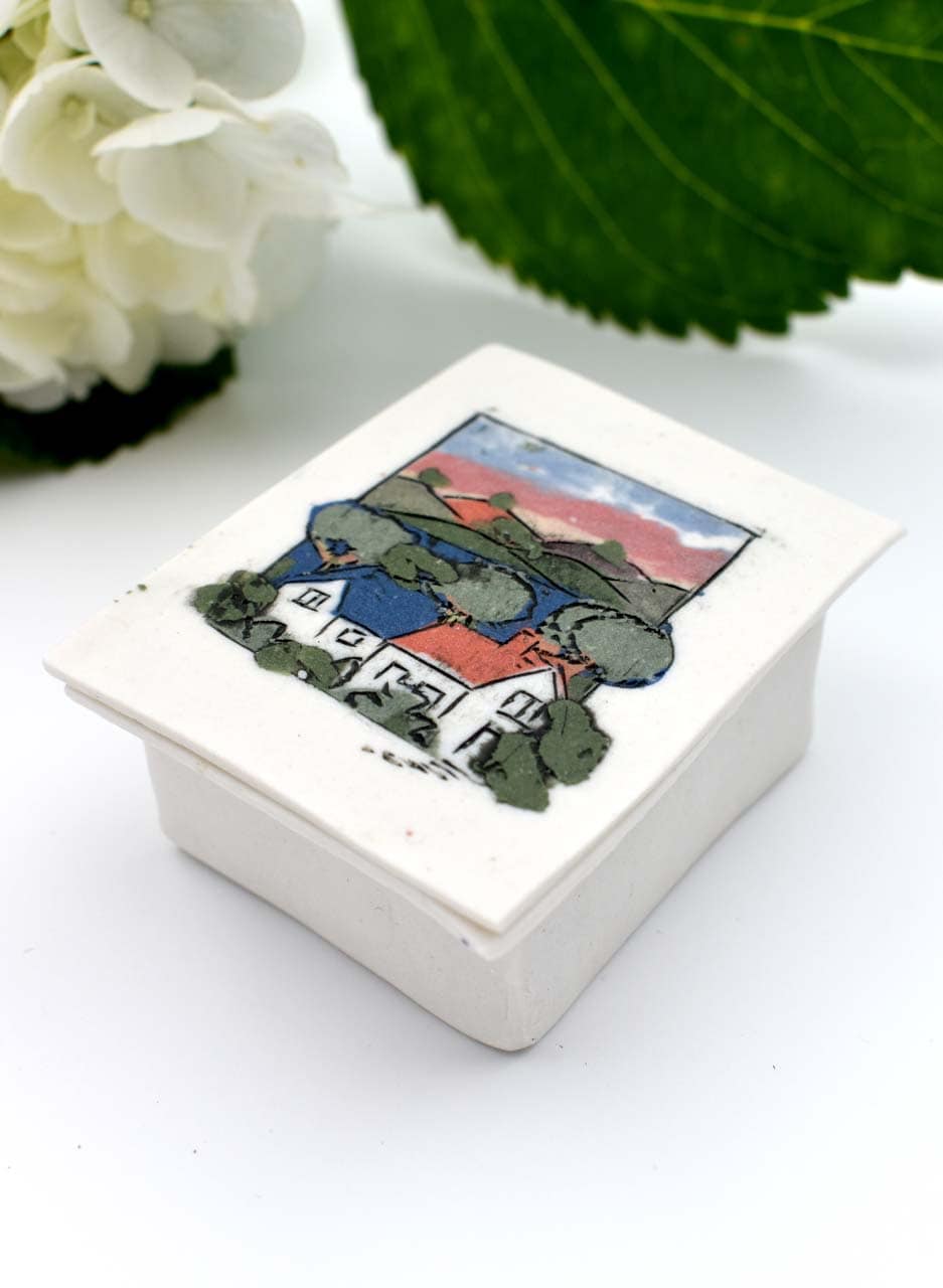 Tui Morse’s tiny inlaid designs are a form of mishima, where fine patterns are carved into leather-hard clay and filled with contrasting slip or small clay pieces. This creates delicate, embedded decorations that look like miniature mosaics landscapes on her boxes.